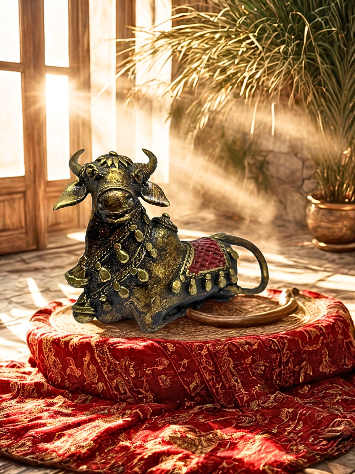 This exquisite Nandi enhances your home decor by adding a touch of spiritual elegance and a burst of color. Whether placed on a pooja altar, a living room shelf, or as a centerpiece in your meditation space, it brings serenity, character, and vibrancy to any setting. Its timeless design, enriched with colorful hues and an antique brass finish, blends seamlessly with both modern and traditional interiors, creating an ambiance of reverence and inspiration.