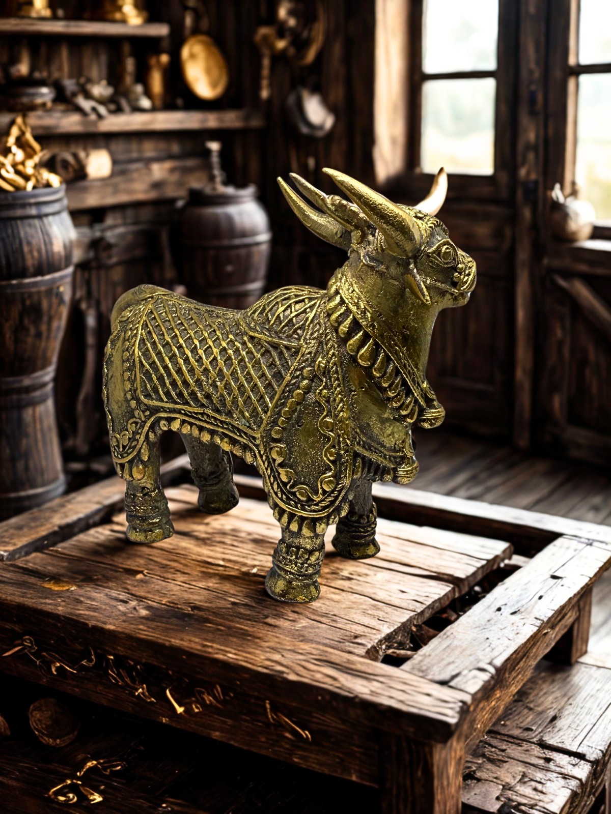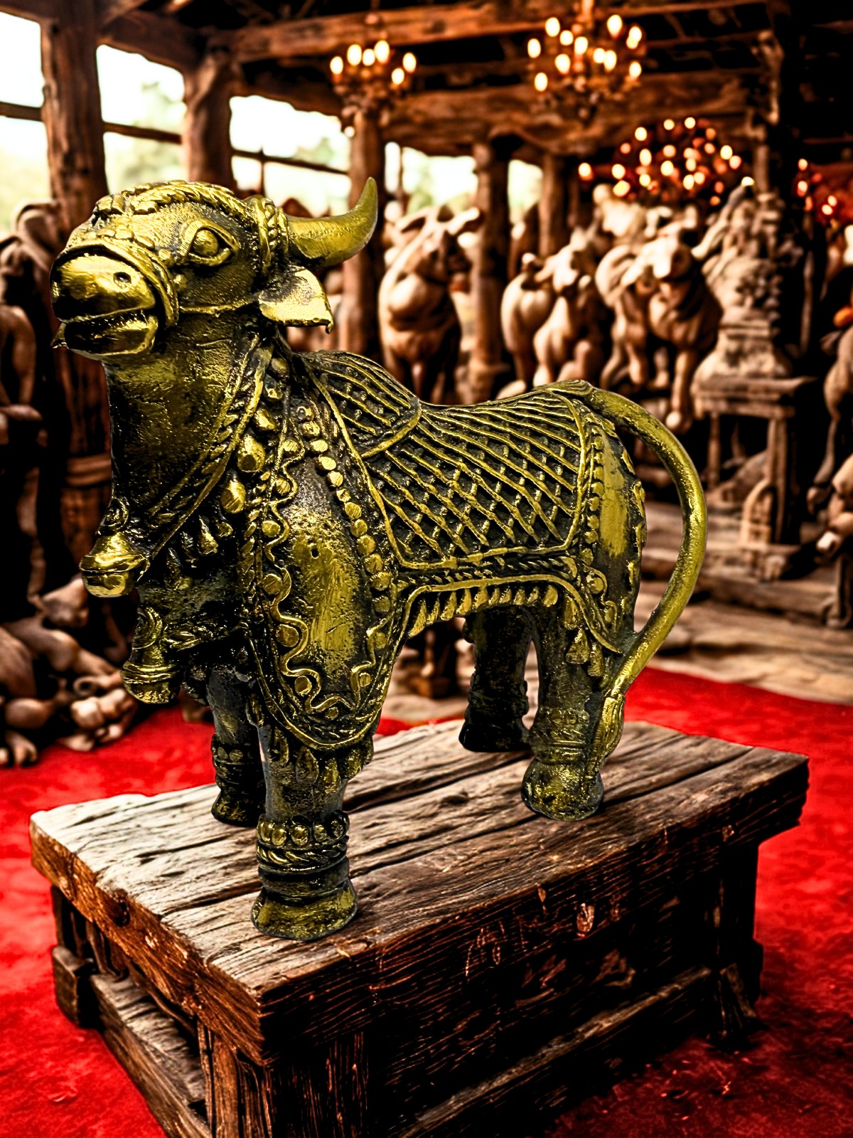 Discover the sacred traditions of India with Nandi – Indian Dhokra Art, a meticulously handcrafted piece that embodies the rich heritage of Indian craftsmanship. Created by skilled artisans using the ancient lost-wax technique of Dhokra art—a method dating back over 4,000 years—this figurine measures 7 x 2.5 x 6 inches and weighs 1.290 kg. It features a sturdy metal frame adorned with natural colors, showcasing intricate tribal patterns that reflect India’s cultural vibrancy. This Nandi figurine captures the divine essence of the sacred bull, a symbol of devotion and strength, often associated with Lord Shiva.